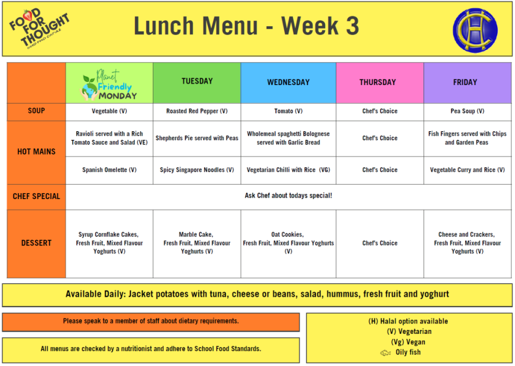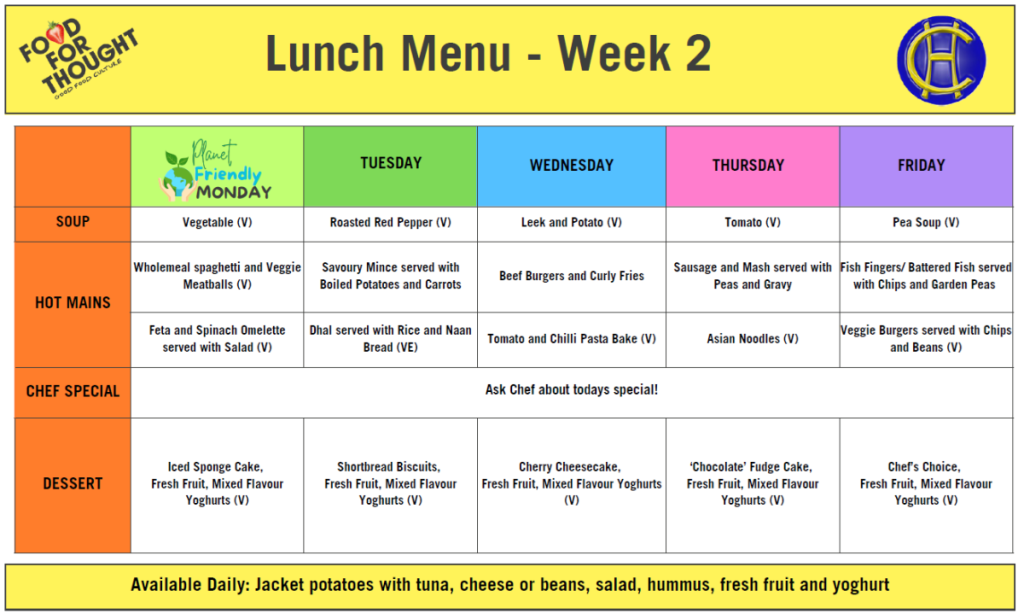 School runs a triweekly Menu. Week 1 will commence Tuesday 2nd September and will rotate weekly with menus Weeks 2 & 3.